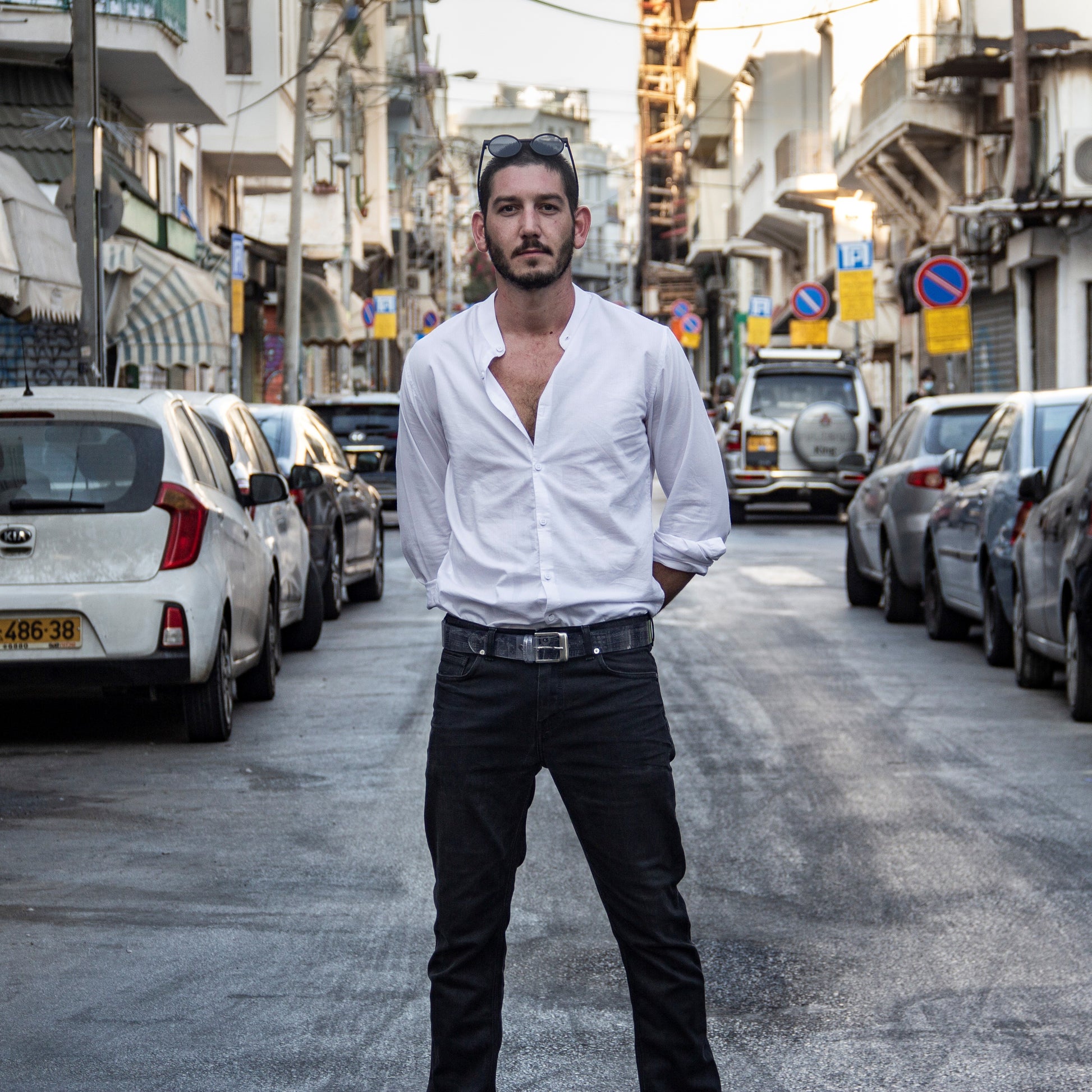 One of a kind belt made by Alef, a Tel Aviv based artist well known for his street art and graffiti all over the city. His unique naive urban style is instantly recognizable through his use of buildings, some of them well known icons and some from his own imagination. We decided to collaborate to create a one of a kind sample of our transparent belt with Alef's hand engraved art.