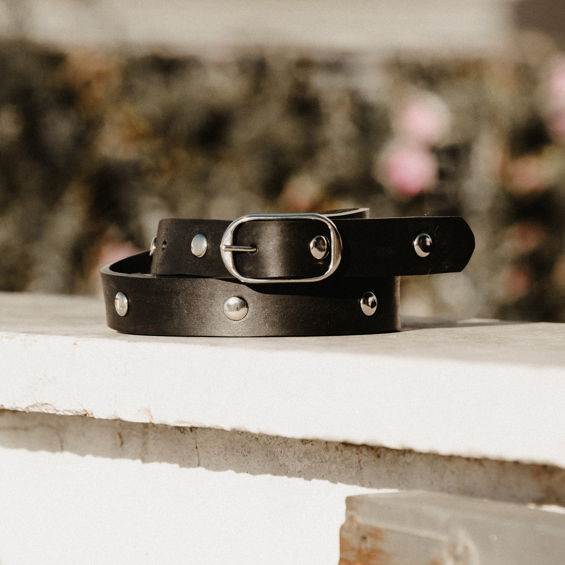 Black vegan unisex studded belt. Hand-crafted from a unique rubber that looks exactly like leather. It is decorated with silver studs and it goes perfect with jeans or black pants.