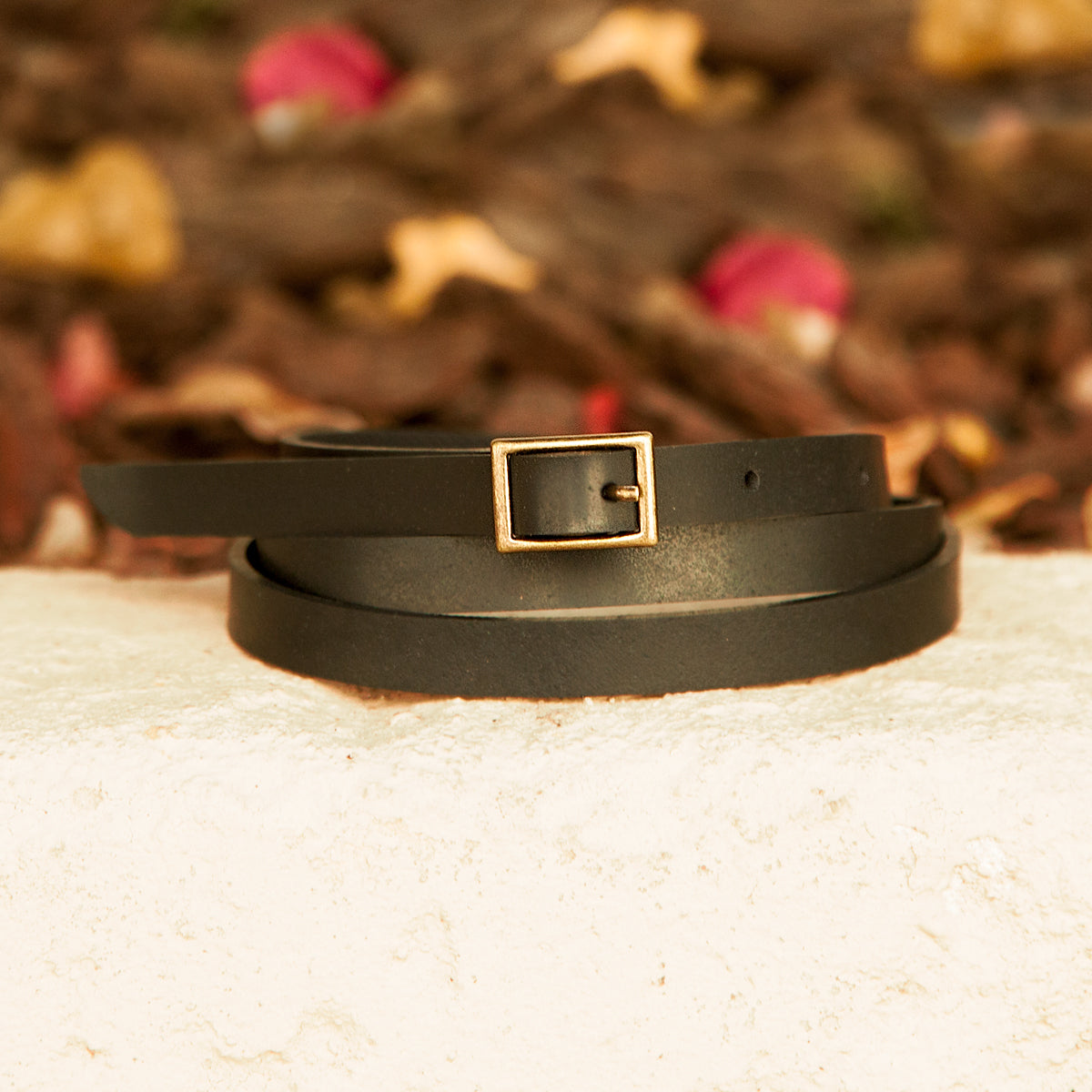 Must-have black slim vegan belt for women. Hand-crafted from a unique rubber that looks exactly like leather. This belt is essential in every wardrobe - perfect for pants, shirts and dresses.